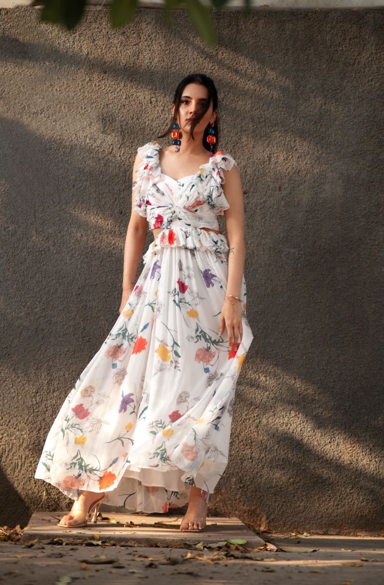 A delicately pleated maxi dress, Abel Dress is crafted with subtle ruffle detailing. It is smocked at the back and has a back zipper for opening. It is made in our ivory floral digital print, handmade with love by the design team. The dress has voluminous gathers at the waist.