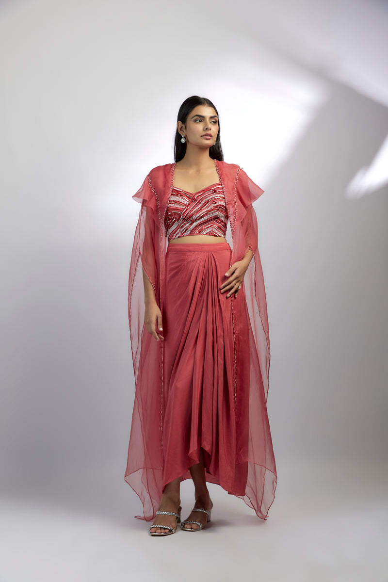 Our Aria Drape Set has a bustier adorned with crystals, glass beads, and bugel beads. It is paired with a draped skirt and a delicate organza jacket. This ensemble effortlessly blends traditional charm with contemporary style. Bustier and skirt is lined.