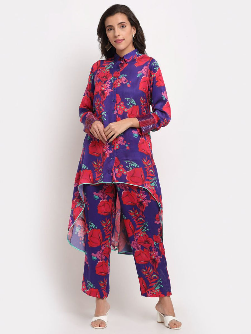 The Floral Printed Coordinate Set consists of a high-low top and straight pants. The sleeves have an intricate hand embroidered cuff detailing done in sequins and beads. The top is voluminous for maximum style with comfort. This floral set is perfect for all celebrations. It is made in a soft and breathable fabric. The trousers are lined.