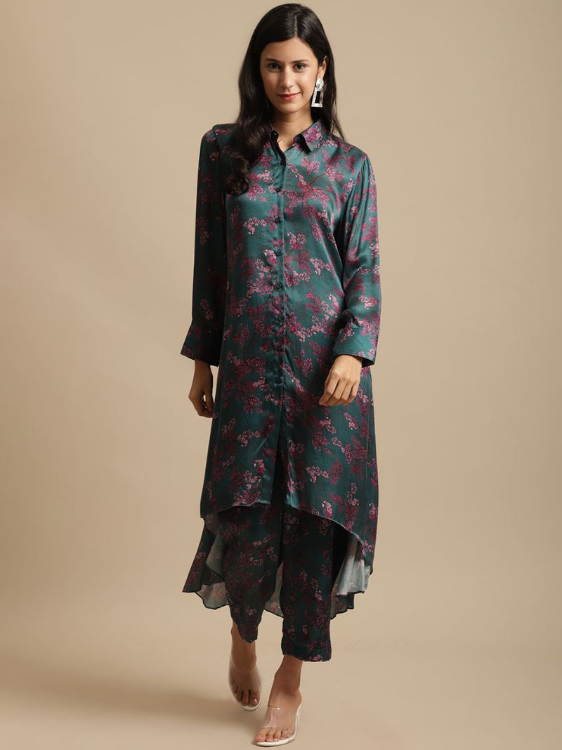 Foliage Coordinate Top is a button down top with shirt collar. It is made in soft sustainable fabric which helps us save 50% water than regular viscose. The top has an asymmetric hemline.