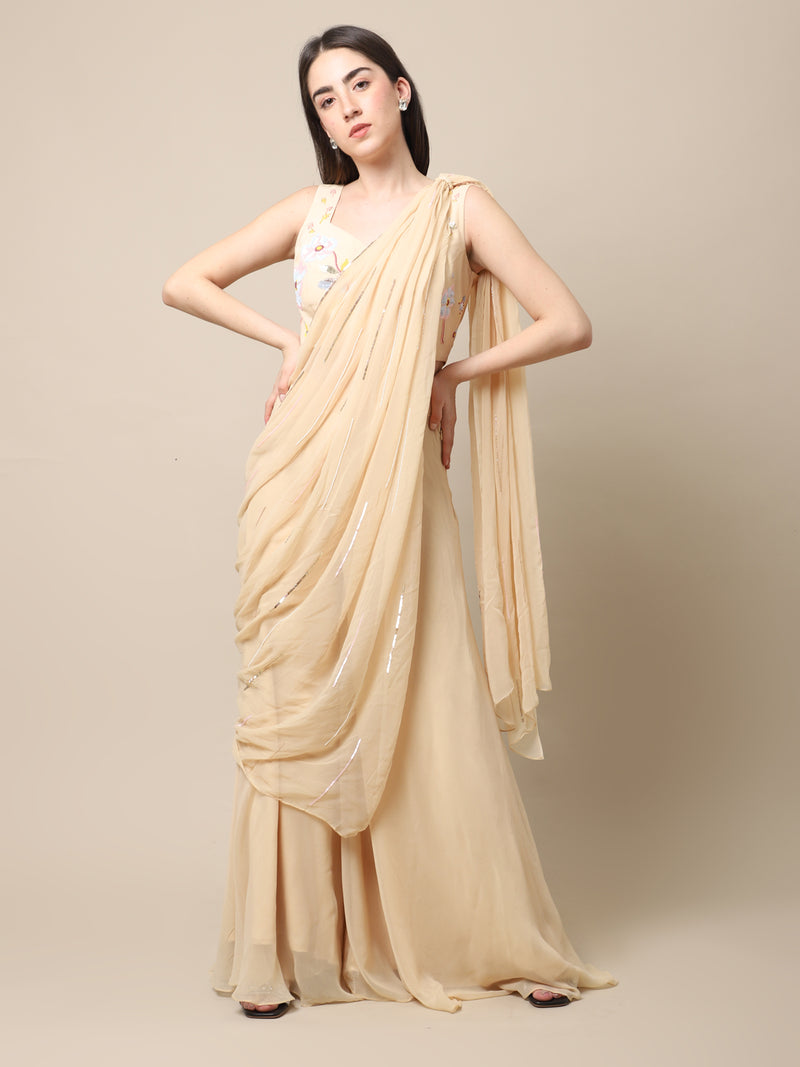 Hand embellished palazzo set featuring draped saree effect in georgette base with a line embroidered dupatta. It is paired with a coordinated embroidered blouse. The palazzo pants have a generous volume with a circle cut. The dupatta comes attached with the pants.