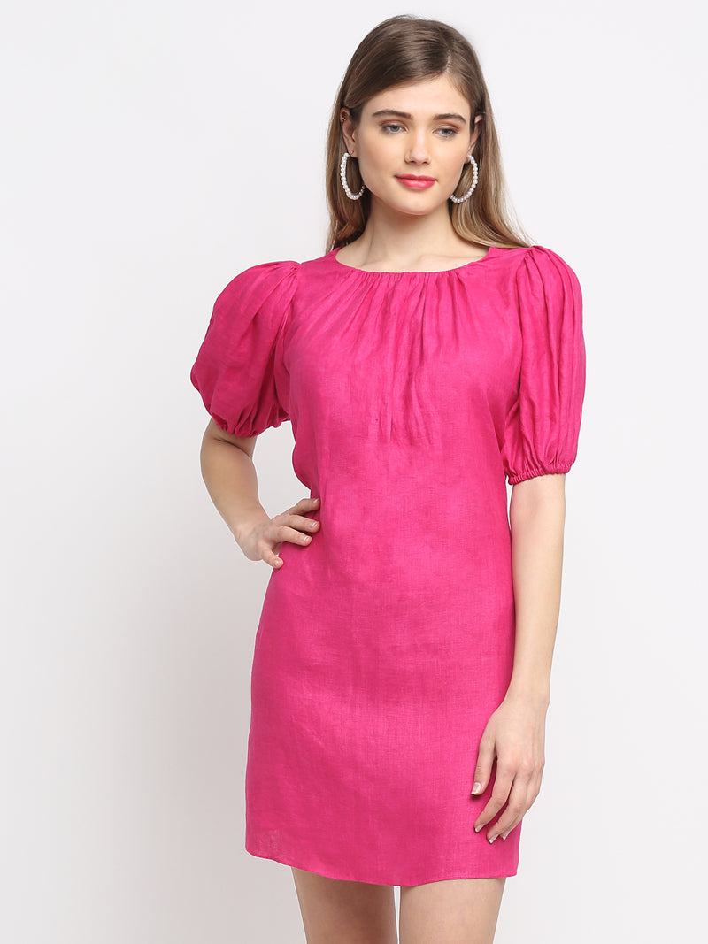 Our Pink tie-up dress has a front zero neck with little pleates on the neckline. It has deep back cutout with elasticated waist and cute playful tie-up. The sleeves are puff with elastic at the hem.