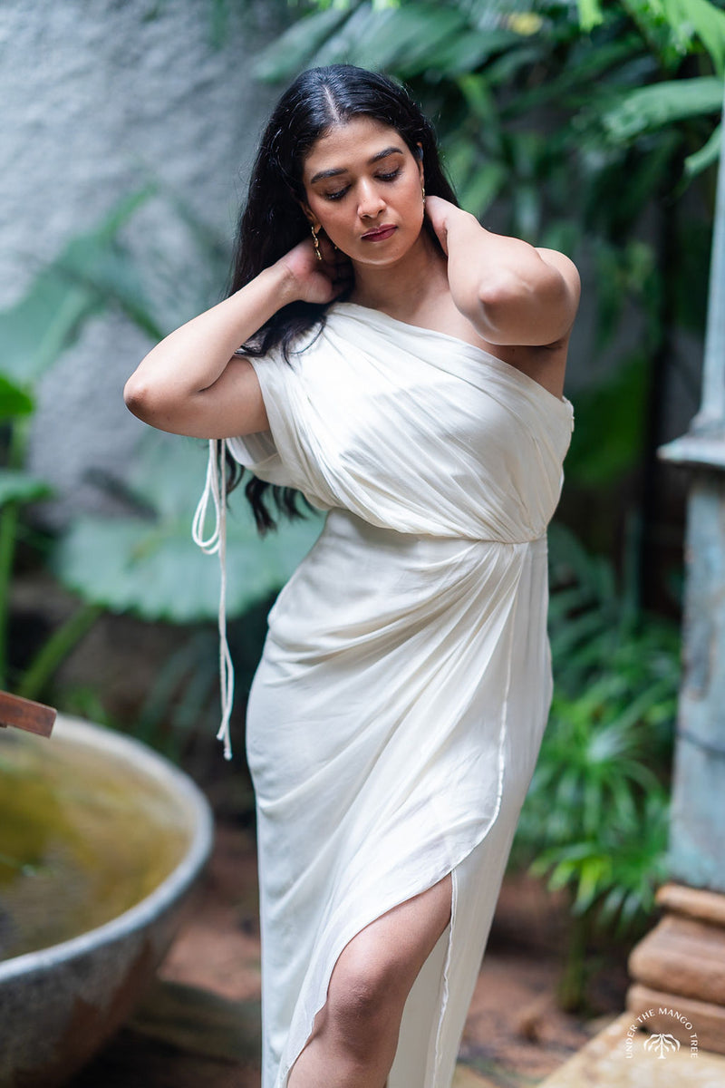 Exuding elegance and grace, the Ivory Cowl Drape Dress features a beautifully draped one-shoulder design and a soft, flowy silhouette. Crafted from luxurious satin georgette, this dress offers a delicate, ethereal look, making it perfect for special occasions. The lightweight georgette fabric enhances its fluid movement, while the timeless ivory hue adds a touch of sophistication and charm