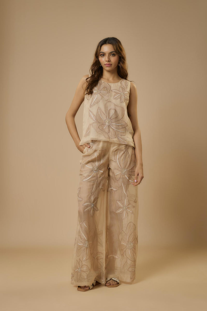 Our exquisite organza ensemble is adorned with intricate, large floral embroidery on both the top and flared trousers, meticulously crafted by an artisan over 72 hours. The top features a back opening, while the trousers have a discreet left-side zipper for a seamless fit. Perfectly tailored for cocktail parties, this stunning piece exudes elegance and sophistication, making it an ideal choice for special occasions. The trousers have short lining while top is fully lined.