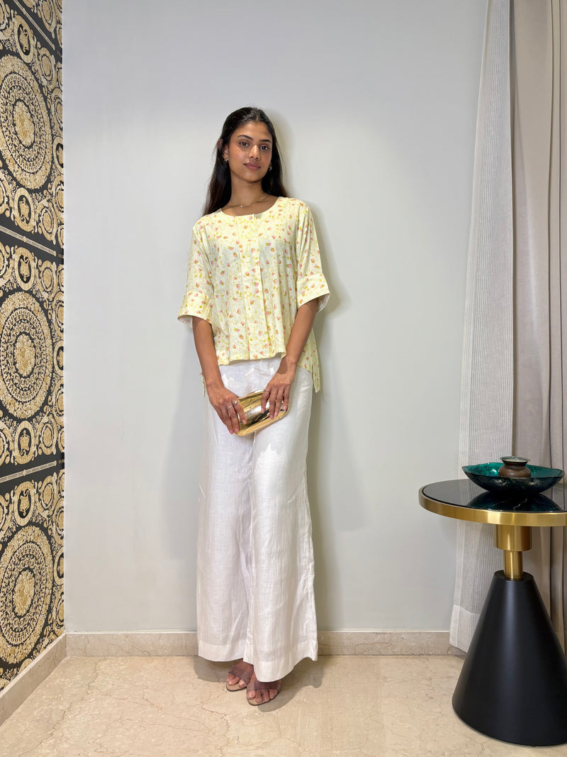 Soft yellow pleated front top with subtle pink floral motifs crafted in lightweight fabric for an airy summer feel. Perfect for casual outings!