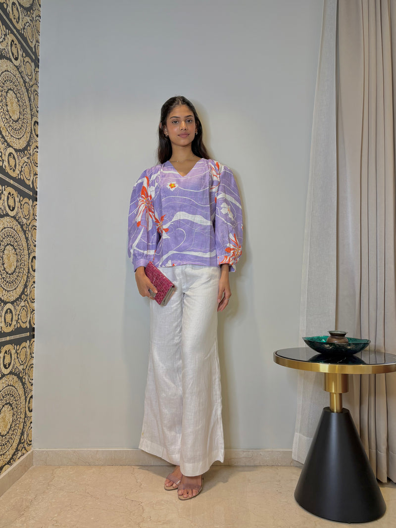 Lilac v-neck top with bold white wave patterns and vibrant floral accents, featuring voluminous sleeves for breezy, statement look. Style it to your casual outings, cafe dates or tea-time get togethers to stand out.