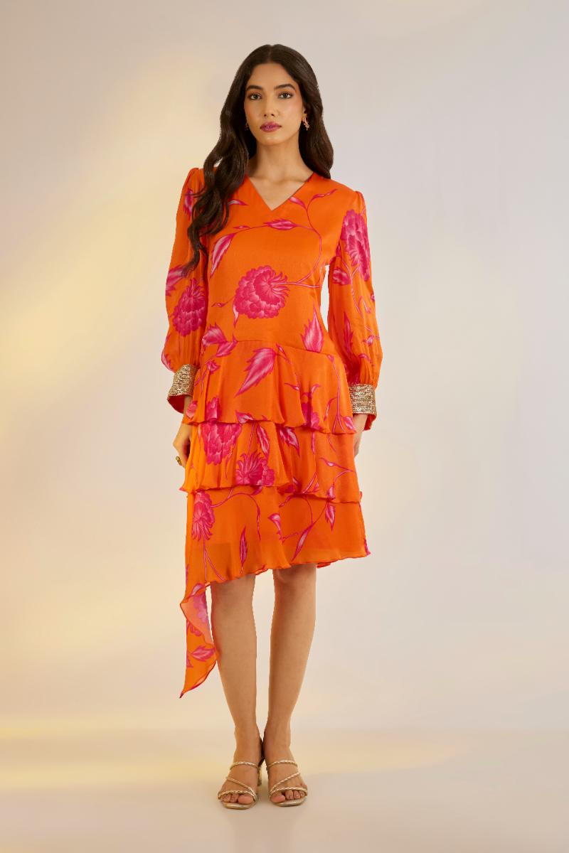 The Orange Mini Dress is crafted in a soft flowy fabric that hugs the body giving it a clean fit. The dress flows into asymmetric tiers. It features a hand embellished cuff to add a fun/indo-western spin to the outfit.