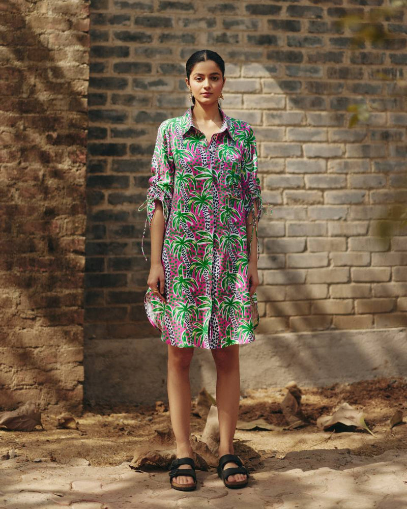An effortless summer essential, the Palm Print Shirt Dress captures the organic beauty of a lush palm garden. Designed for both style and comfort, it features a hand-embellished pocket detail and chic tie-up sleeves. Crafted from sustainable hemp fabric, this dress offers a breathable and lightweight feel, perfect for warm days. The refreshing pink and green palette enhances its nature-inspired charm, making it a versatile and elegant addition to your wardrobe
