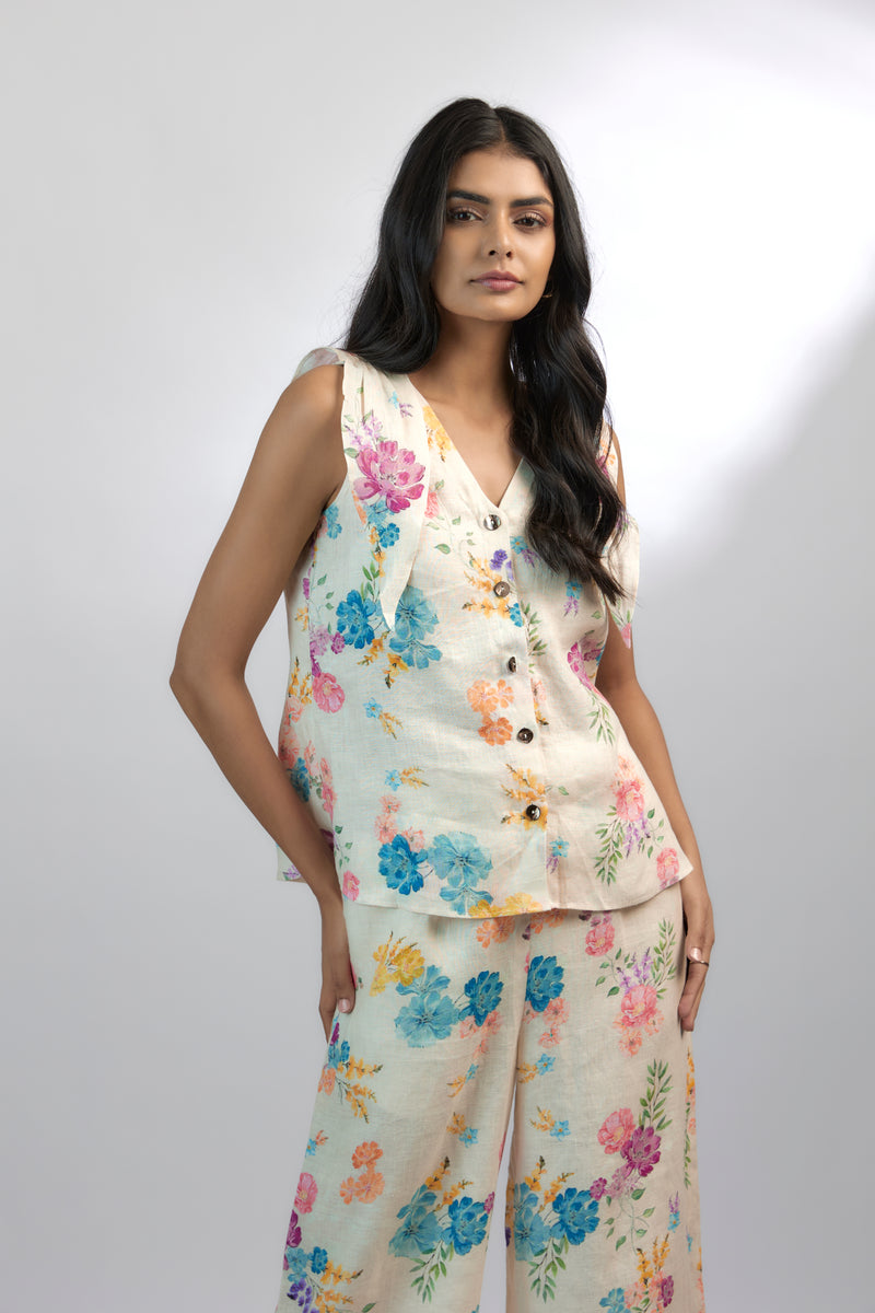 Our Petal Pop Hemp Coord is a trendy and comfortable. It features a vibrant floral print in pastel colors made by design team in the studio. The top has front button down with natural shell buttons. There's a bow knot detail on the shoulders. The trouser has pocket and has a very comfortable flare. Style it up for a holiday or carry it for a casual day look. The look works well for all body types.