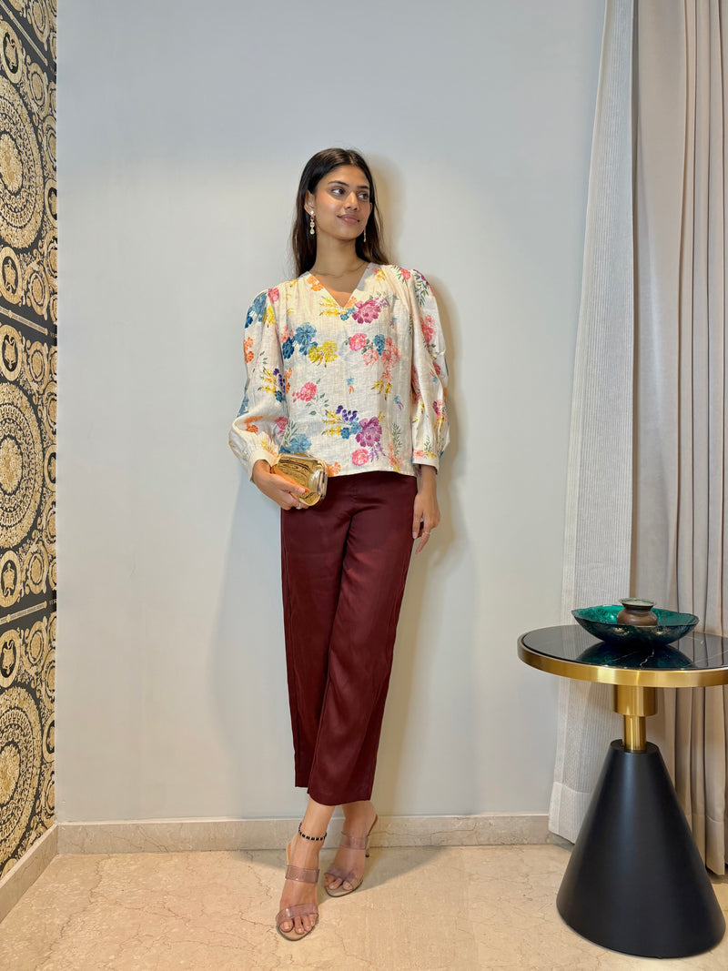 Our Petal Pop V-Neck Top features a balloon s. It is crafted in hemp fabric which is soft and breathable. Style it up for casual outings and vacations.