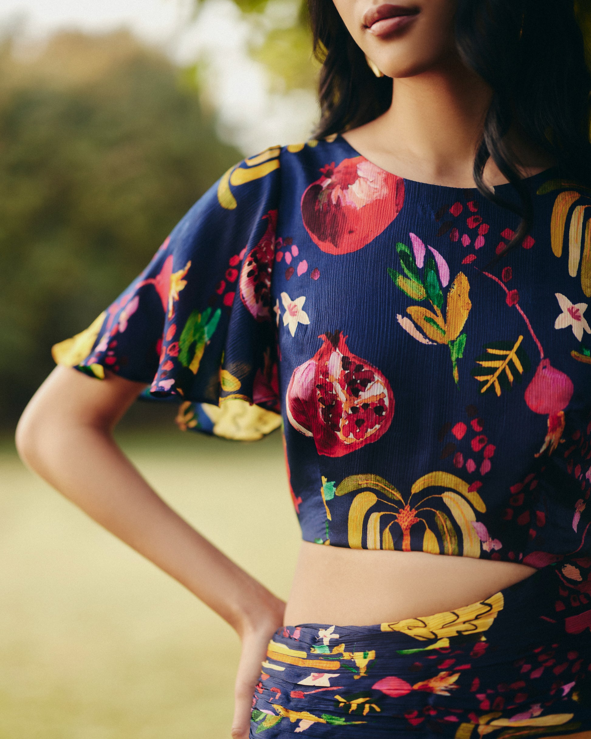 Our Pine Maxi Dress as seen on Geneve, features a bold tropical fruit print with a sleek cut-away detail. The ruched details and flowing chiffon fabric create a flattering silhouette, making it perfect for vacations, evening events, or resort wear. It has a side zipper for closure.