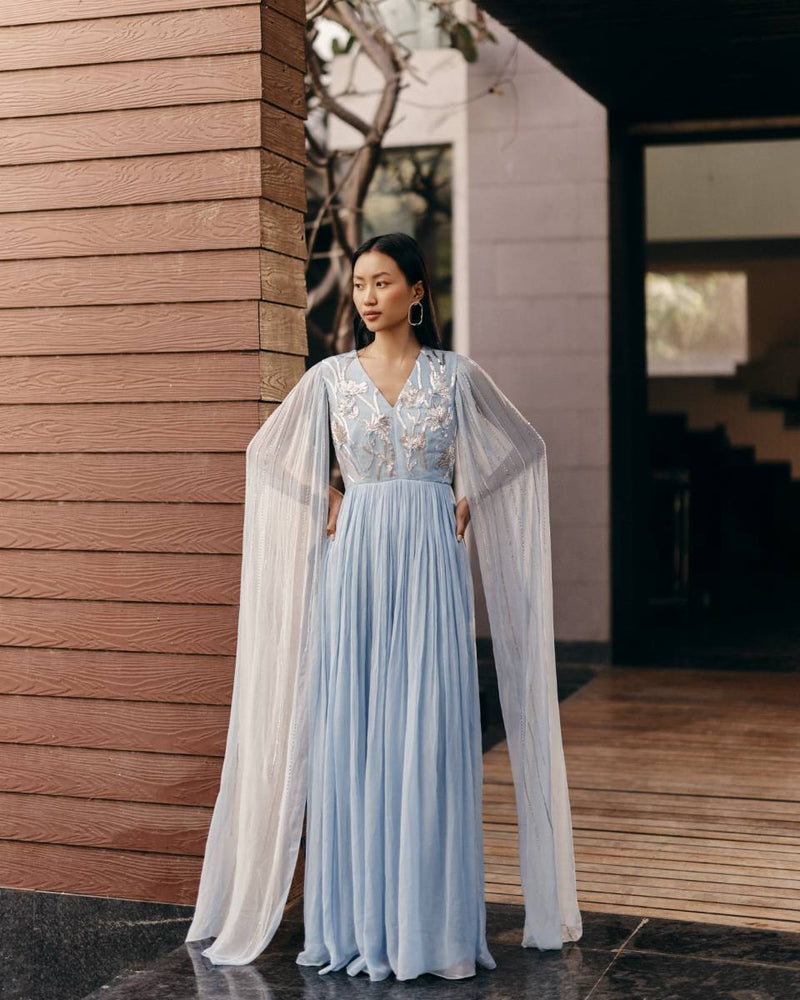 This graceful floor-length gown in a serene powder blue hue exudes elegance and sophistication. Adorned with delicate floral embroidery on the bodice, it beautifully blends timeless charm with modern allure. The pleated flow of the lightweight georgette fabric creates an airy, ethereal movement, making it a perfect choice for formal occasions, festive gatherings, or evening soirées. The high round neckline enhances its refined appeal, ensuring a look that is both poised and effortlessly graceful.