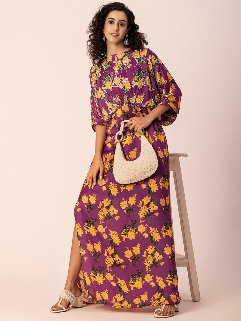 Our Purple Bloom Maxi Dress is a charming blend of purple hues and playful patterns. The draped body is highlighted with ivory line embroidery on body. The dress also has side slits.