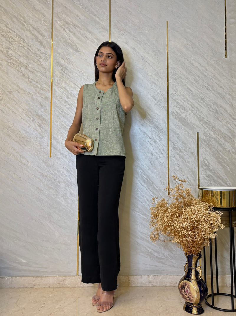 Sage green sleeveless vest with a round neckline, wooden style buttons, and a soft textured finish for a versatile timeless look.