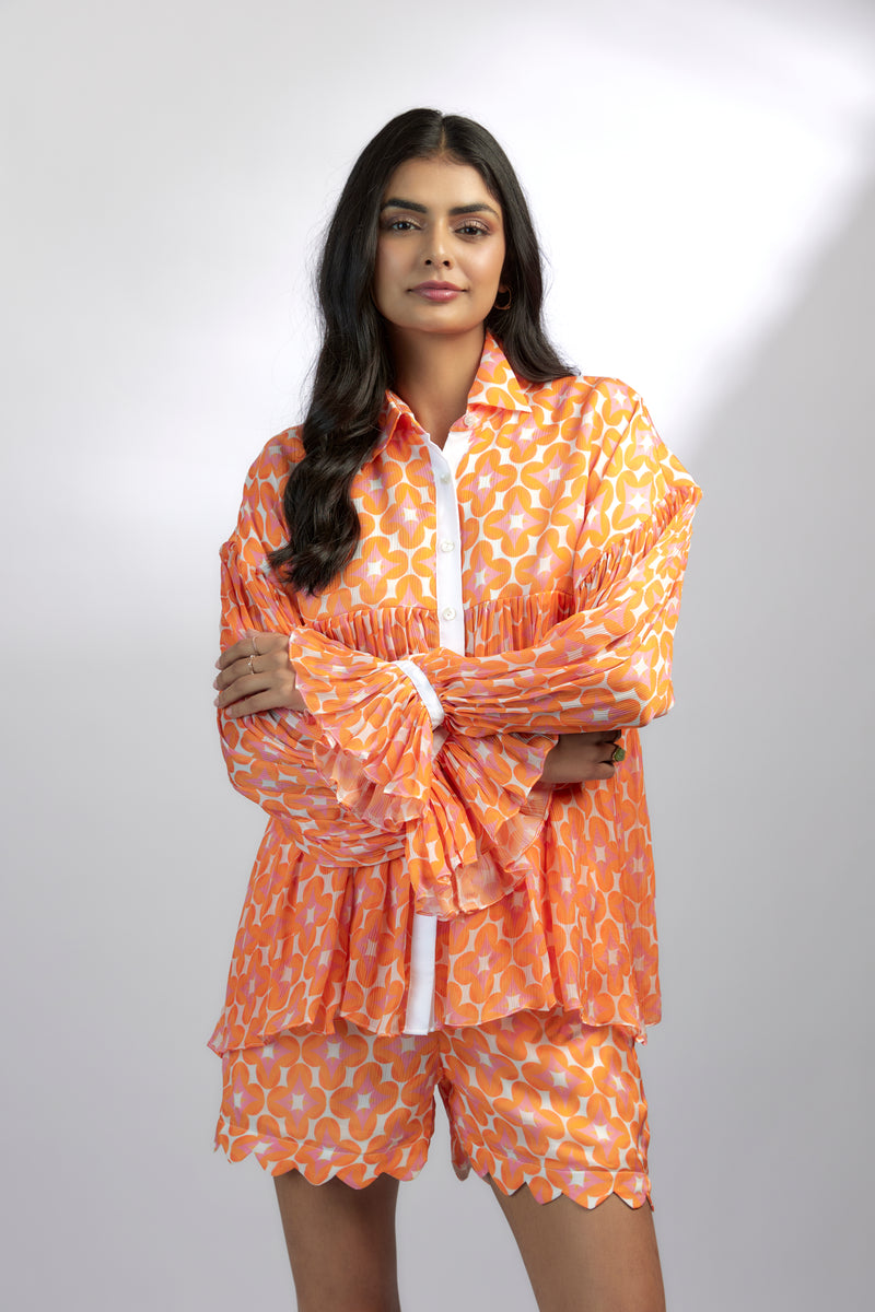 The Tangello Coord Set features dropped shoulders, ruffle cuffs, and white panel detailing on the blouse. It has a front button down. This ensemble is completed with a pair of shorts which has a scallop hemline for a touch of romance. Crafted for both style and comfort. It's a must have vacation wear.