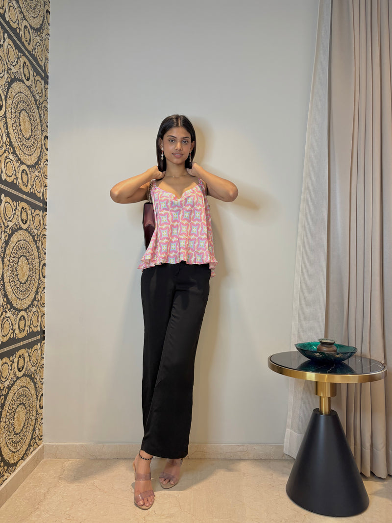 This flared spaghetti top in out candy floss print is a statement and standout piece for all your casual café or fancy outings!