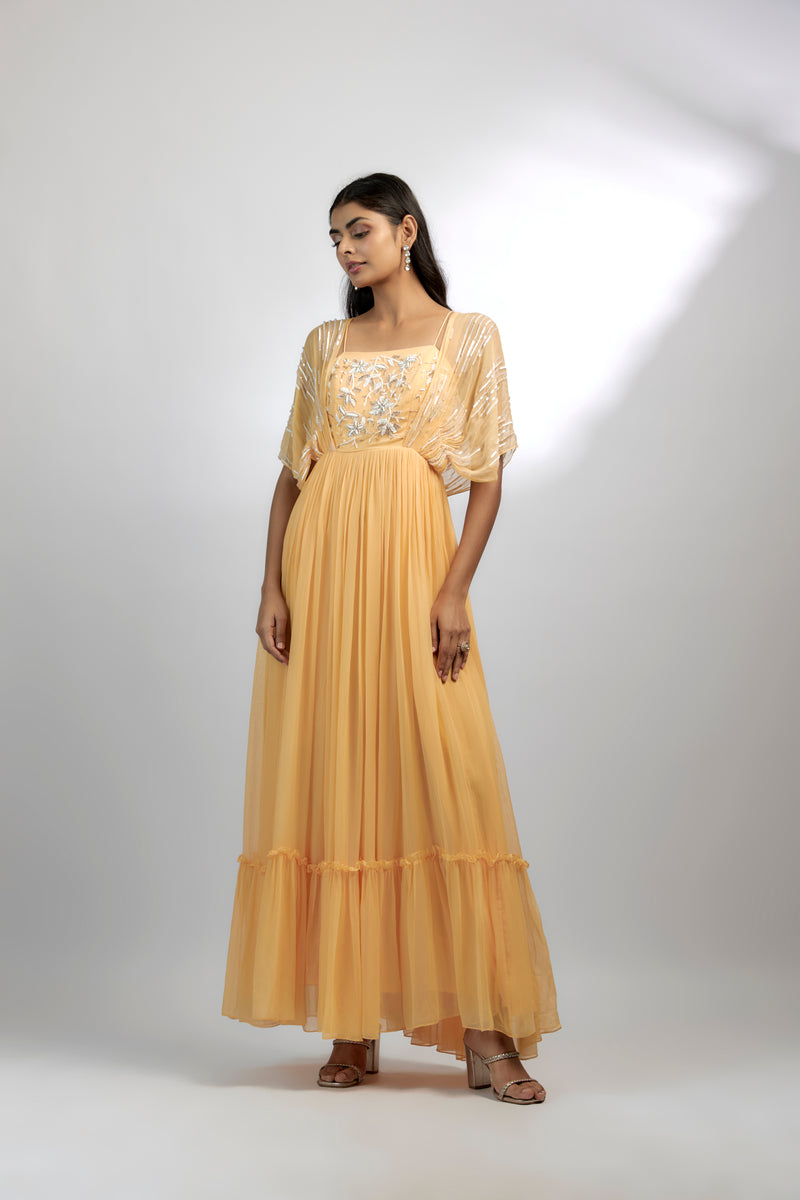 Our Twilight Tango Gown features intricate flower embroidery on the bodice. The draped sleeves has a line embroidery. It has a back zipper opening. Perfect for a gala affair or a romantic evening under the stars, this gown is sure to leave a lasting impression.