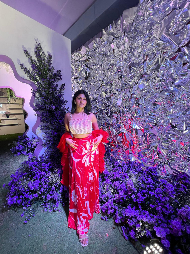 Our Wave Print Lehenga is a fun and lightweight lehenga for bridesmaids at the wedding. The blouse is hand embroidered with pearls, glass beads and bugel beads. The skirt with its traditional silhouette has a generous flare offering a classic yet timeless look.