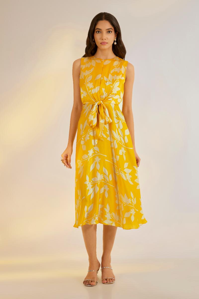 Our Yellow Knot Dress is an absolute favourite by all and a wardrobe classic. It has a front tie-up detail. It features delicate cutouts on the waist. The skirt is flared and is crafted in Bemberg fabric. It is a certified eco-friendly fabric which is very soft on the skin and resists microbial growth.